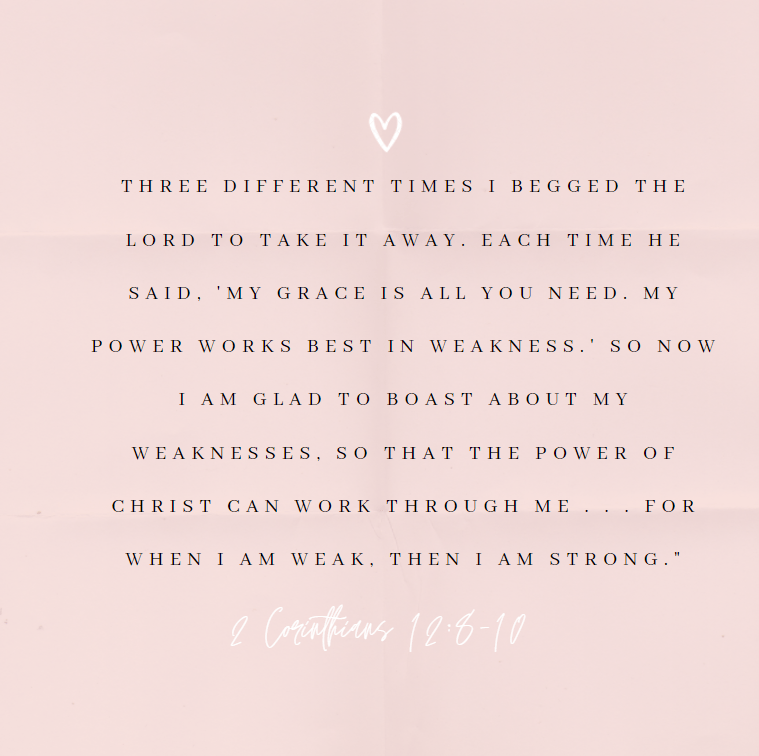 Second Corinthians 12:8-10 says, “Three different times I begged the Lord to take it away. Each time he said, ‘My grace is all you need. My power works best in weakness.’ So now I am glad to boast about my weaknesses, so that the power of Christ can work through me . . . For when I am weak, then I am strong” (NLT).