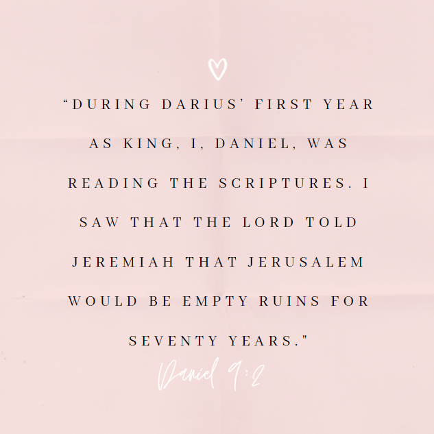 “During Darius’ first year as king, I, Daniel, was reading the Scriptures. I saw that the LORD told Jeremiah that Jerusalem would be empty ruins for seventy years” (Daniel 9:2 NCV).