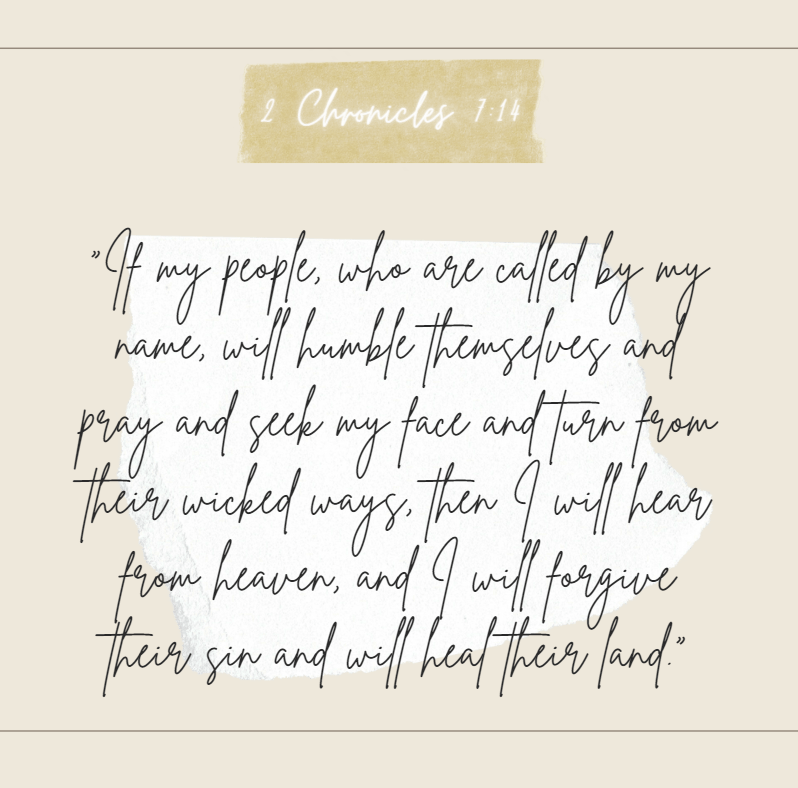 “If my people, who are called by my name, will humble themselves and pray and seek my face and turn from their wicked ways, then I will hear from heaven, and I will forgive their sin and will heal their land” (2 Chronicles 7:14 NIV).