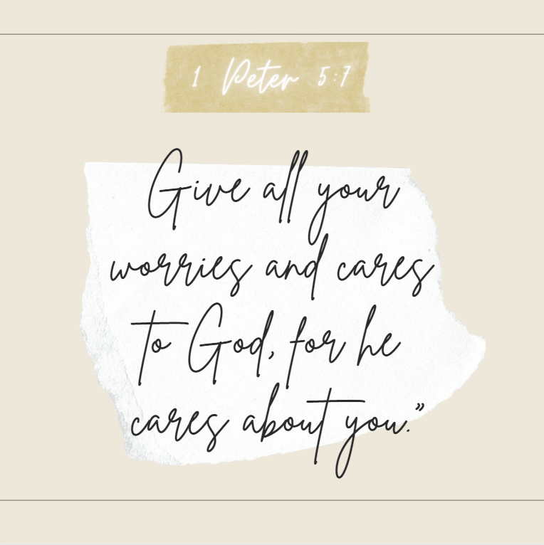 “Give all your worries and cares to God, for he cares about you” (1 Peter 5:7 NLT).