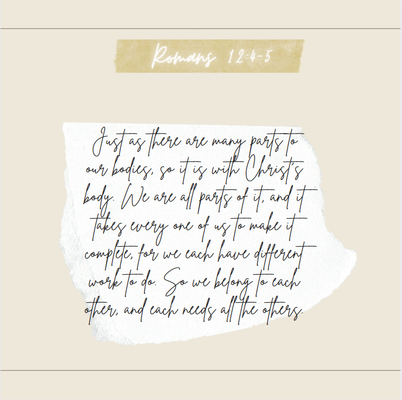 The Bible says, “Just as there are many parts to our bodies, so it is with Christ’s body. We are all parts of it, and it takes every one of us to make it complete, for we each have different work to do. So we belong to each other, and each needs all the others” (Romans 12:4-5 TLB).
