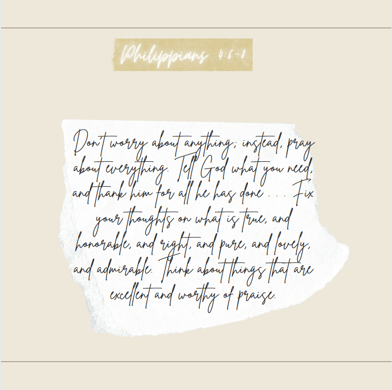 The Bible says, “Don’t worry about anything; instead, pray about everything. Tell God what you need, and thank him for all he has done . . . Fix your thoughts on what is true, and honorable, and right, and pure, and lovely, and admirable. Think about things that are excellent and worthy of praise” (Philippians 4:6-8 NLT).