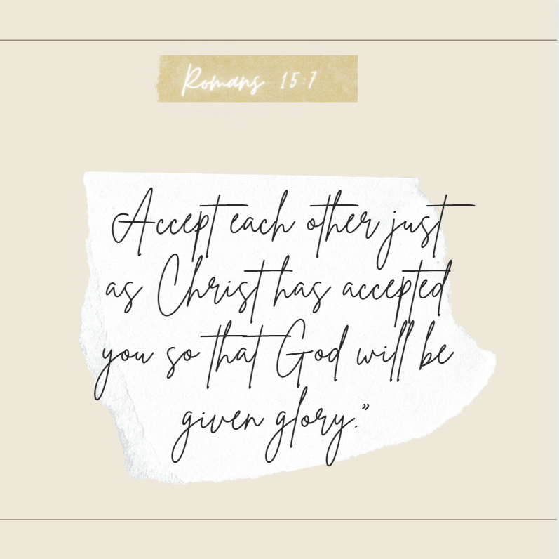 Romans 15:7 says, “Accept each other just as Christ has accepted you so that God will be given glory” (NLT).