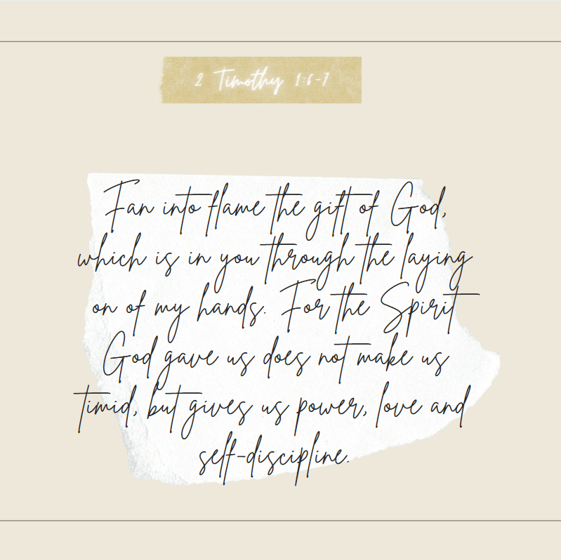 Paul also told Timothy to “fan into flame the gift of God, which is in you through the laying on of my hands. For the Spirit God gave us does not make us timid, but gives us power, love and self-discipline” (2 Timothy 1:6-7 NIV).