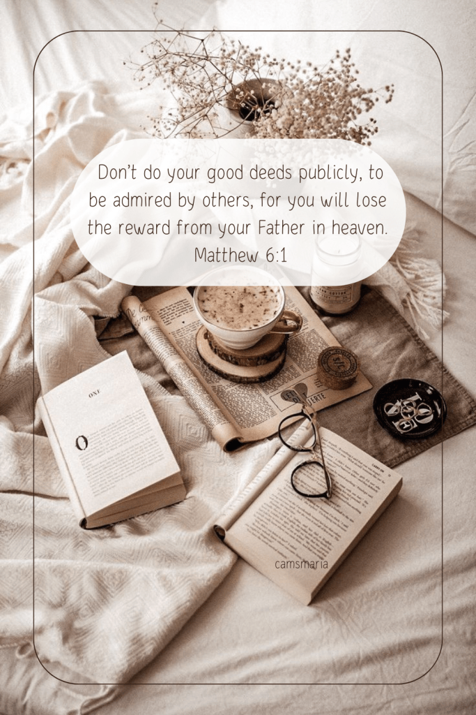 “Watch out! Don’t do your good deeds publicly, to be admired by others, for you will lose the reward from your Father in heaven.” Matthew 6:1 (NLT)