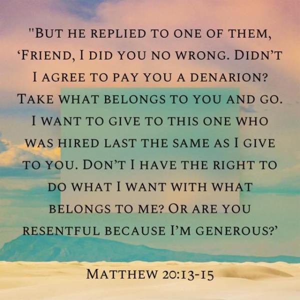 “Friend, I didn’t cheat you. I paid you exactly what we agreed on. . . . What business is it of yours if I want to pay them the same that I paid you? Don’t I have the right to do what I want with my own money?” (Matthew 20:13-15 CEV) When it looks like... Continue Reading →
